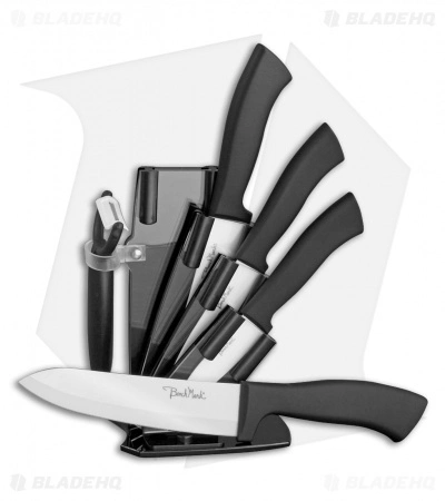 The Benchmark 6-Piece Ceramic Kitchen set is a great addition to any kitchen! White ziconium oxide blades maintain an extremely sharp edge while black rubberized handles provide a comfortable and secure grip. Display your set with the included black knife stand.