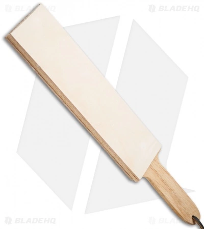 This paddle strop from Garos goods features maple wood construction and a double sided, tanned cow hide leather strop. The strop is 2.0″ by 8.125″, with an overall length of 11.875″. Item includes a brown leather lanyard strap for securing to your wrist or hanging storage. An essential item for any sharpening kit.