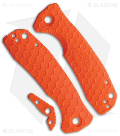 - Quality orange FRN honeycomb patterned scales and backspacer for a Large Honey Badger knife.