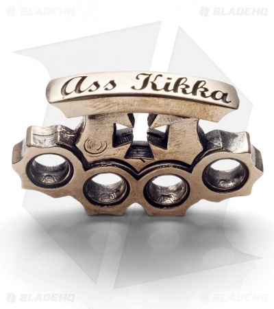 A miniature set of knuckles, the “Ass Kikka” pendant bead from Lion Armory comes with a gold-tone jump ring for connecting to a key ring, backpack, or chain.