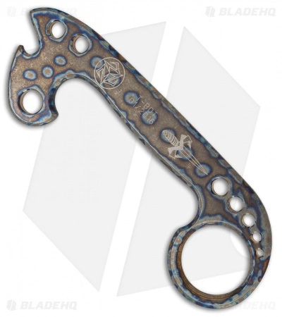 Designed as a tactical defense implement, the D.C. Munroe / Marfione Custom T-Bot collaboration is a slick bottle opener as well. An effort was made to create a tool that could be legal everywhere and the non-intimidating T-Bot is the result. This model features 3/16″ thick titanium construction with a random flame colored finish. As a result of the hand applied finish, actual model will vary from picture above.