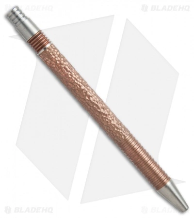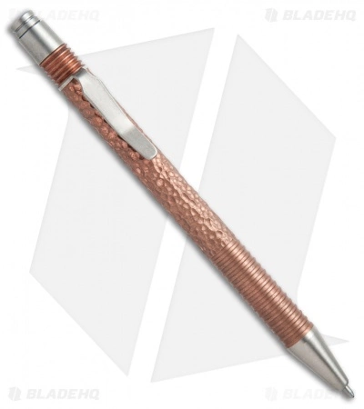 The handcrafted Matthew Martin 375 Series Tactical Click Pen features a textured copper body with a titanium tip and pocket clip. This model has a natural copper finish. The pen uses a German-made nickel-plated click mechanism. A pure delight to behold and use.
