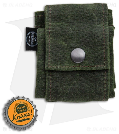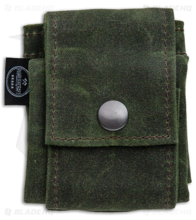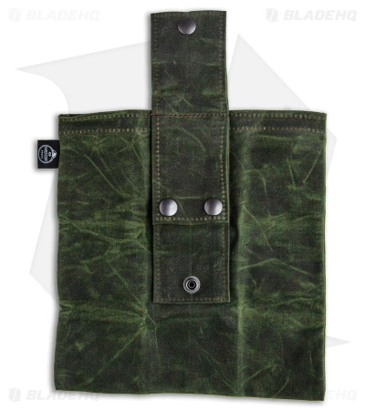 - Olive drab green 9″ by 8.75″ waxed canvas bag with heavy-duty snaps.