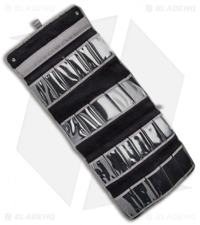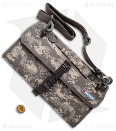 Protect your knives with the Real Steel Pilgrim 22 Knife Bag. It is made of digital camo 1050 ballistic nylon with a berber fleece interior to protect from scratching and weathering. It features 22 TUP see-through pockets for holding each of your knives. It has a handle for easy carry and measures 7.7″ x 14.2″ x 2.5″. The front has an aluminum plate for added protection and a Duraplex quick release access and lock.