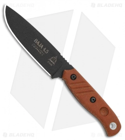 Made from 5/32″ thick 1095 high carbon steel, the 4.875″ drop point blade can take on even the toughest cutting tasks. Brown micarta handles scales are comfortable in hand and have excellent traction. An integral bow drill divot allows for an easy primitive fire starting method without additional tools. Carry the Baja 4.5 in the included black leather belt sheath.