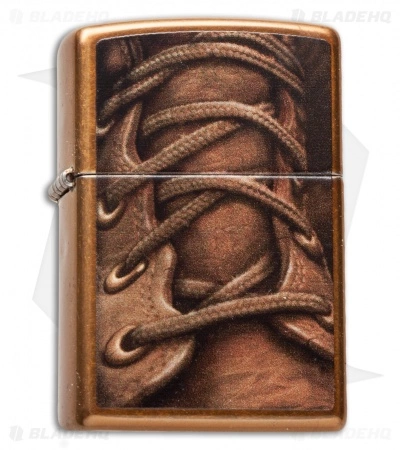 This authentic refillable Zippo lighter features Toffeeâ„¢ finished body with a brown boot laces graphic.