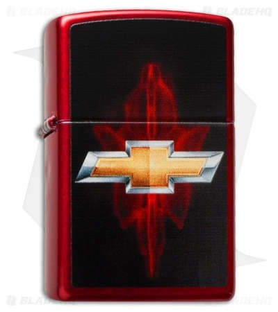 This authentic refillable Zippo lighter features a Candy Apple Red finished body with a Chevy bowtie graphic. Officially licensed product.