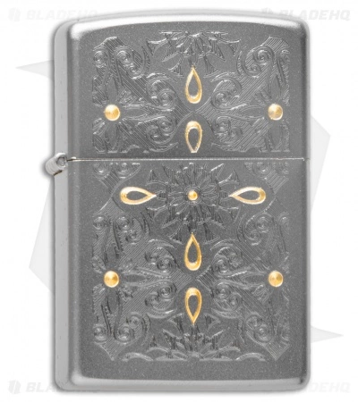 This authentic refillable Zippo lighter features a satin chrome finished body with a classical ornate etching.