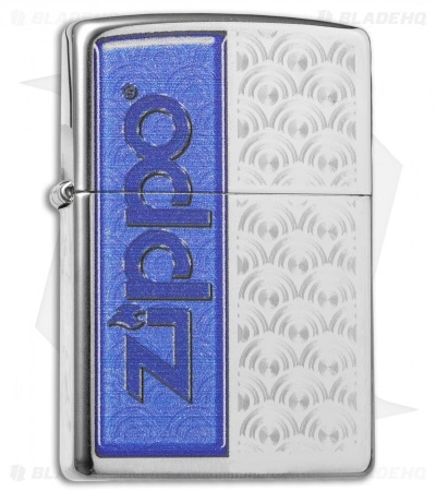 This authentic refillable Zippo lighter features a high polish chrome body with a swirl pattern and blue Zippo logo.