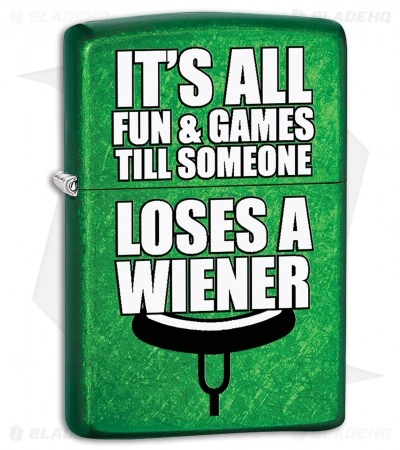 It’s all fun and games ’till someone loses a wiener has been stylishly color imaged onto a meadow matte lighter.