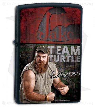 This Zippo model features a matte black finish and a Turtleman Jake graphic.