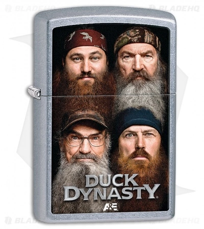 This Zippo model features a street chrome finish and a Duck Dynasty graphic.