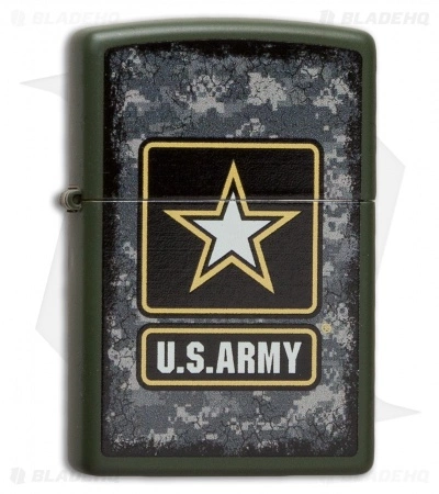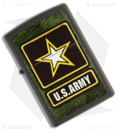 Matte black Zippo lighter features the U.S. Army star logo against a green background.